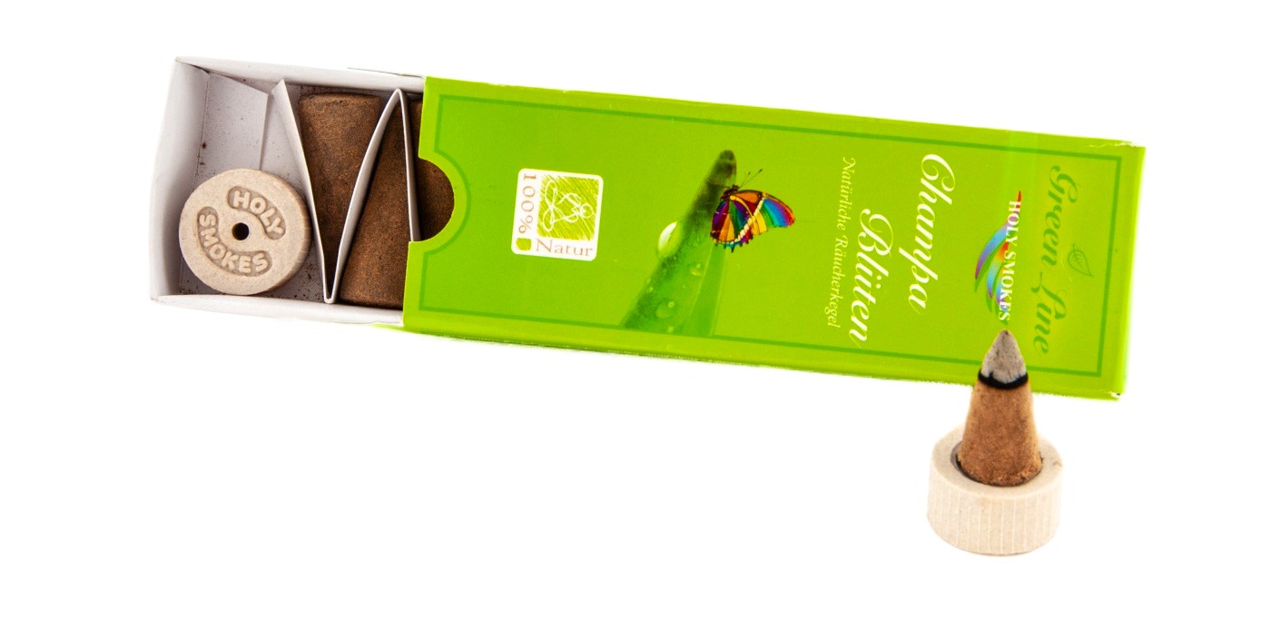Den Räucherkegel an der Spitze anzünden, die Flamme sanft auswedeln und