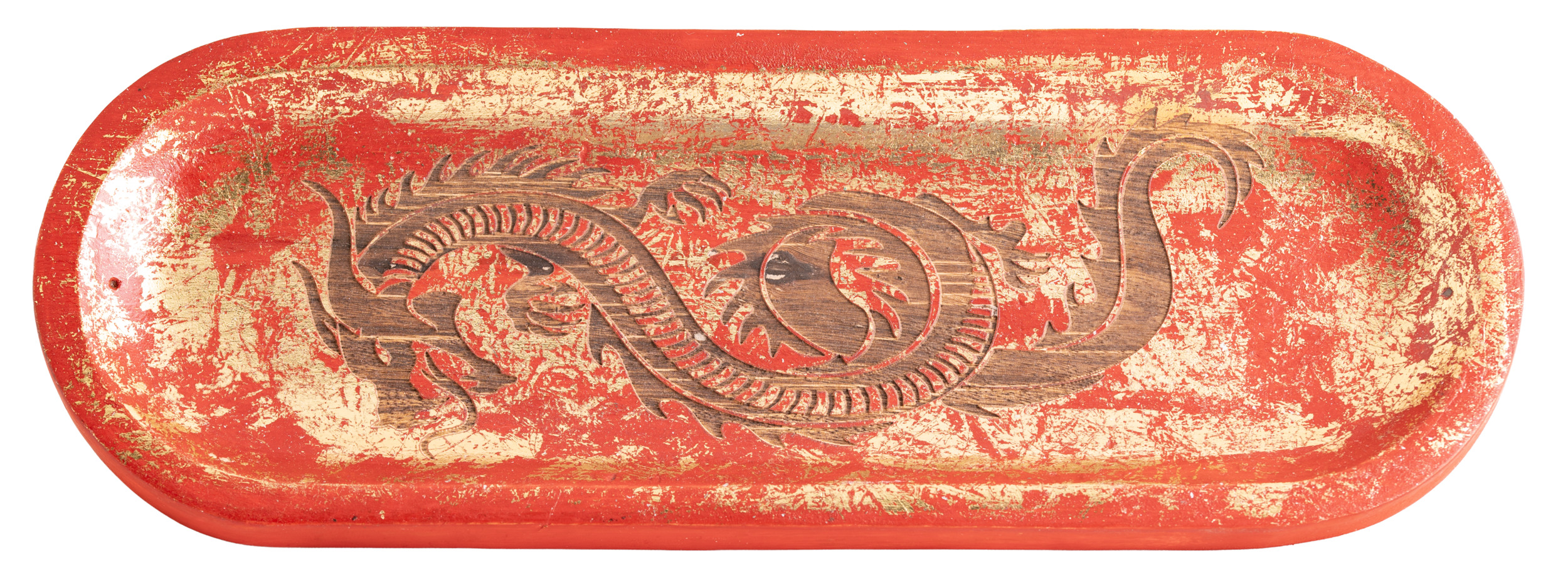 Preview: Drache Rot-Goldverzierung - Superbreiter & massiver Räucherstäbchenhalter aus Mangoholz - Berk